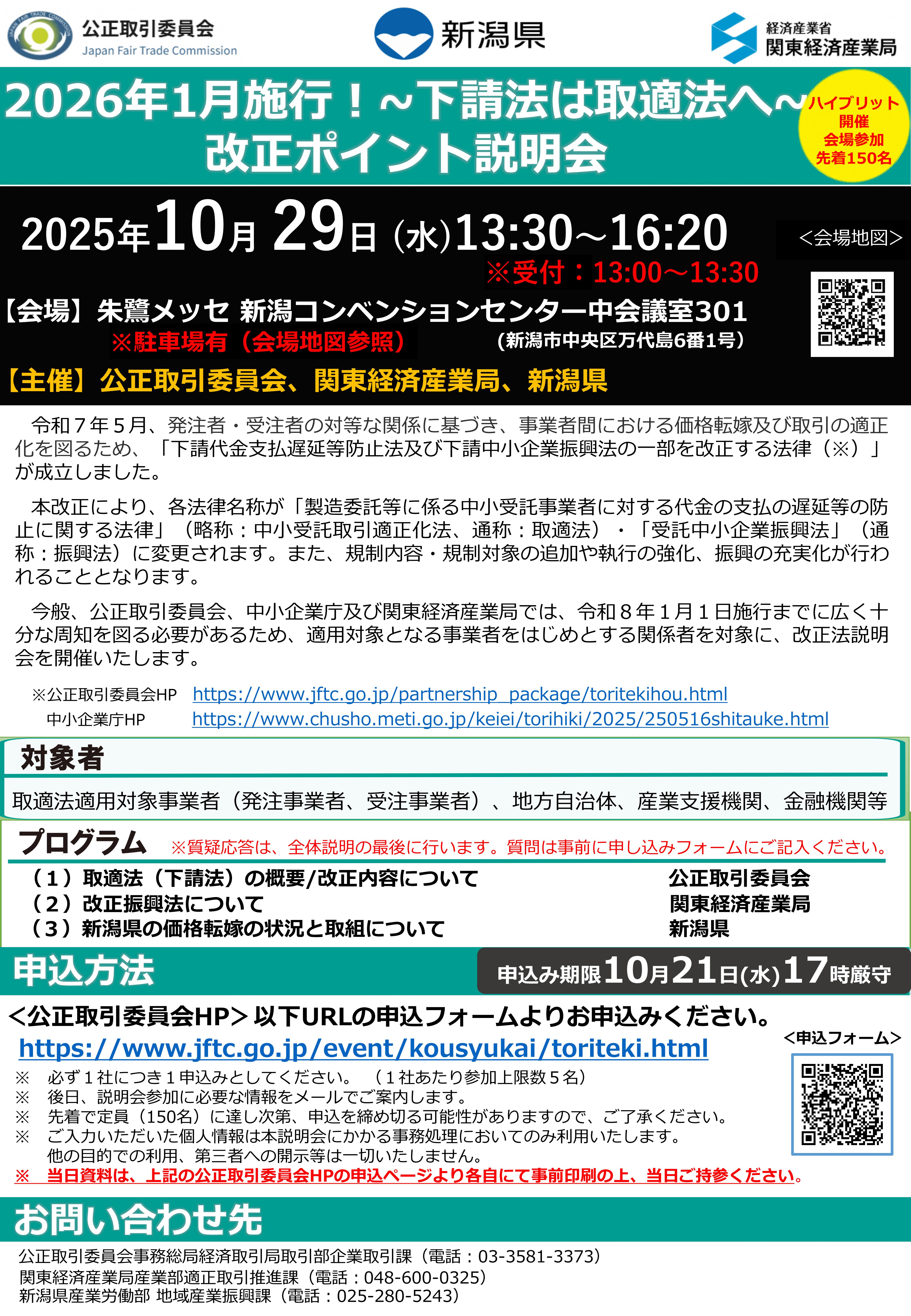 公正取引委員会による、2026年1月に施行される改正下請代金支払遅延等防止法(下請法、「中小受託取引適正化法(通称:取適法)」へ名称変更となる)の概要および改正内容についての説明会が開催されます。