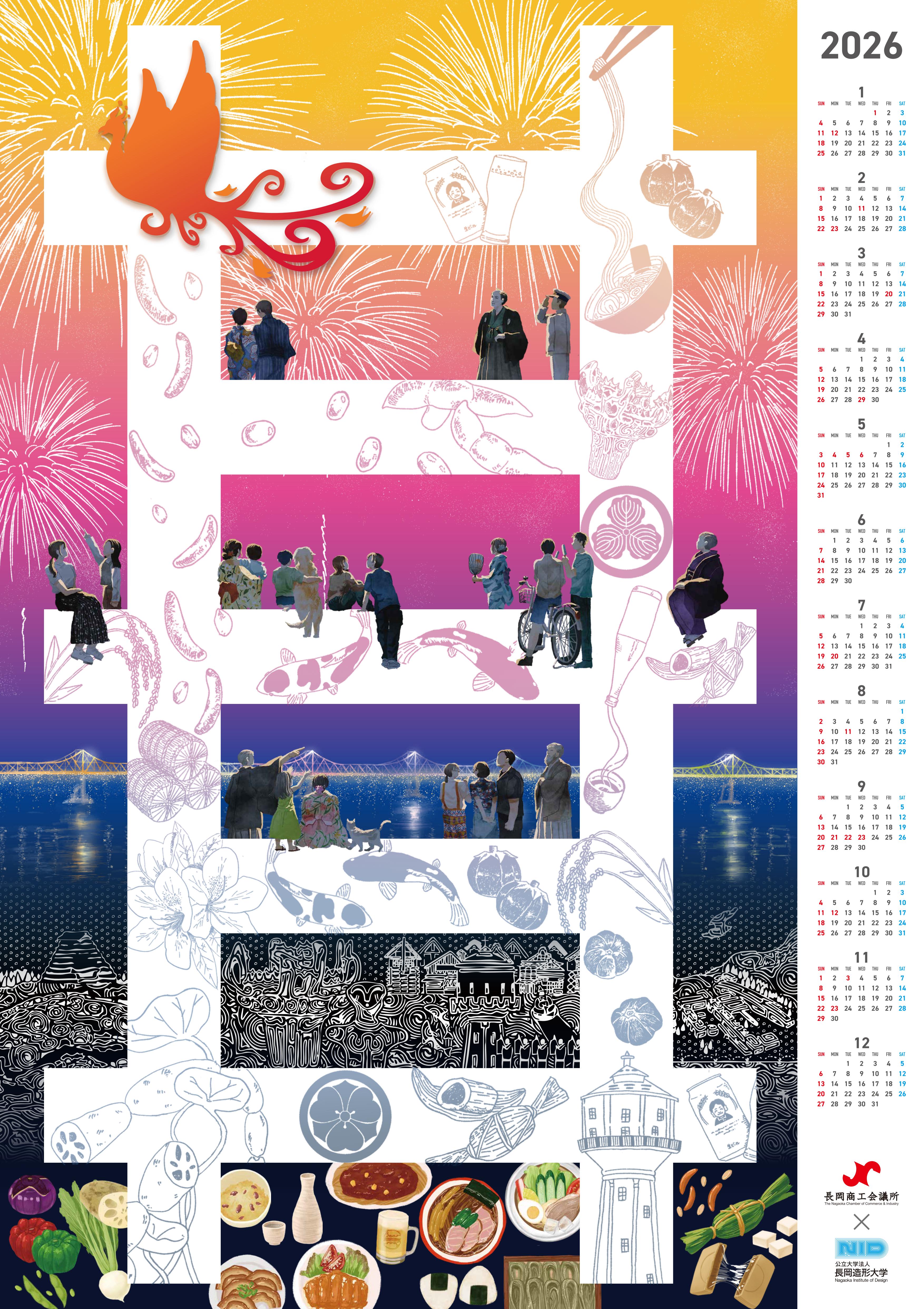 「2026 長岡商工会議所カレンダー」は、産学連携の一環として、昨年に引き続き長岡造形大学にデザインをお願いし、視覚デザイン学科4年・デザイン学科3年の6名の皆様から長岡地域の魅力を表現していただきました。