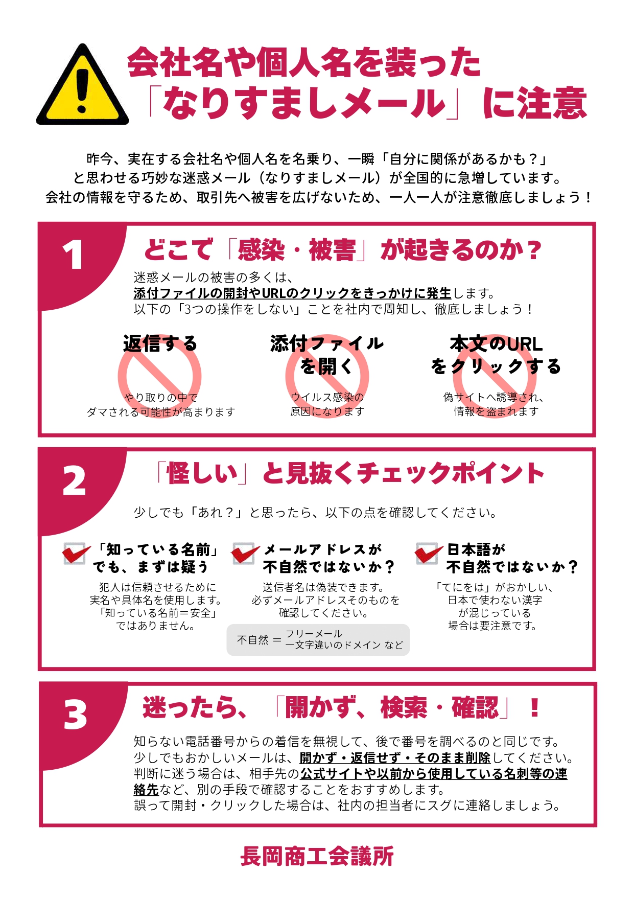 貴社の情報を守るため、取引先へ被害を広げないため、社内への注意徹底をお願いいたします。