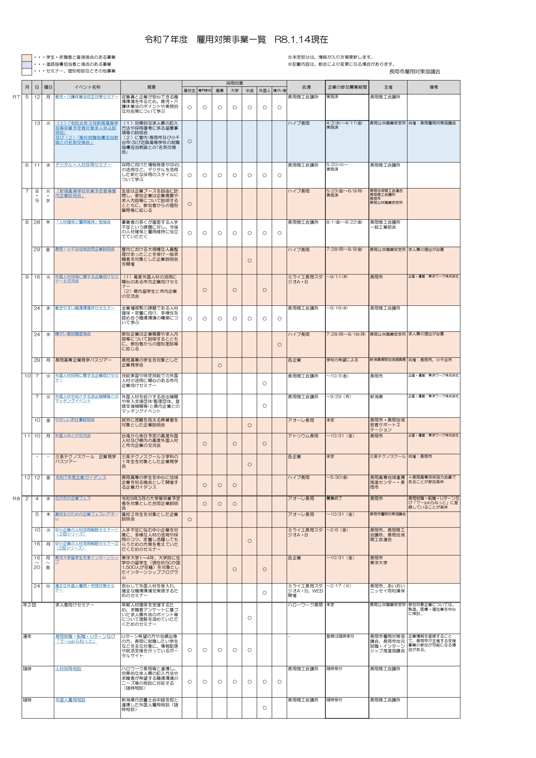 令和7年度に、長岡市やハローワーク長岡、長岡商工会議所等で開催する、雇用対策事業のスケジュールをお知らせいたします。