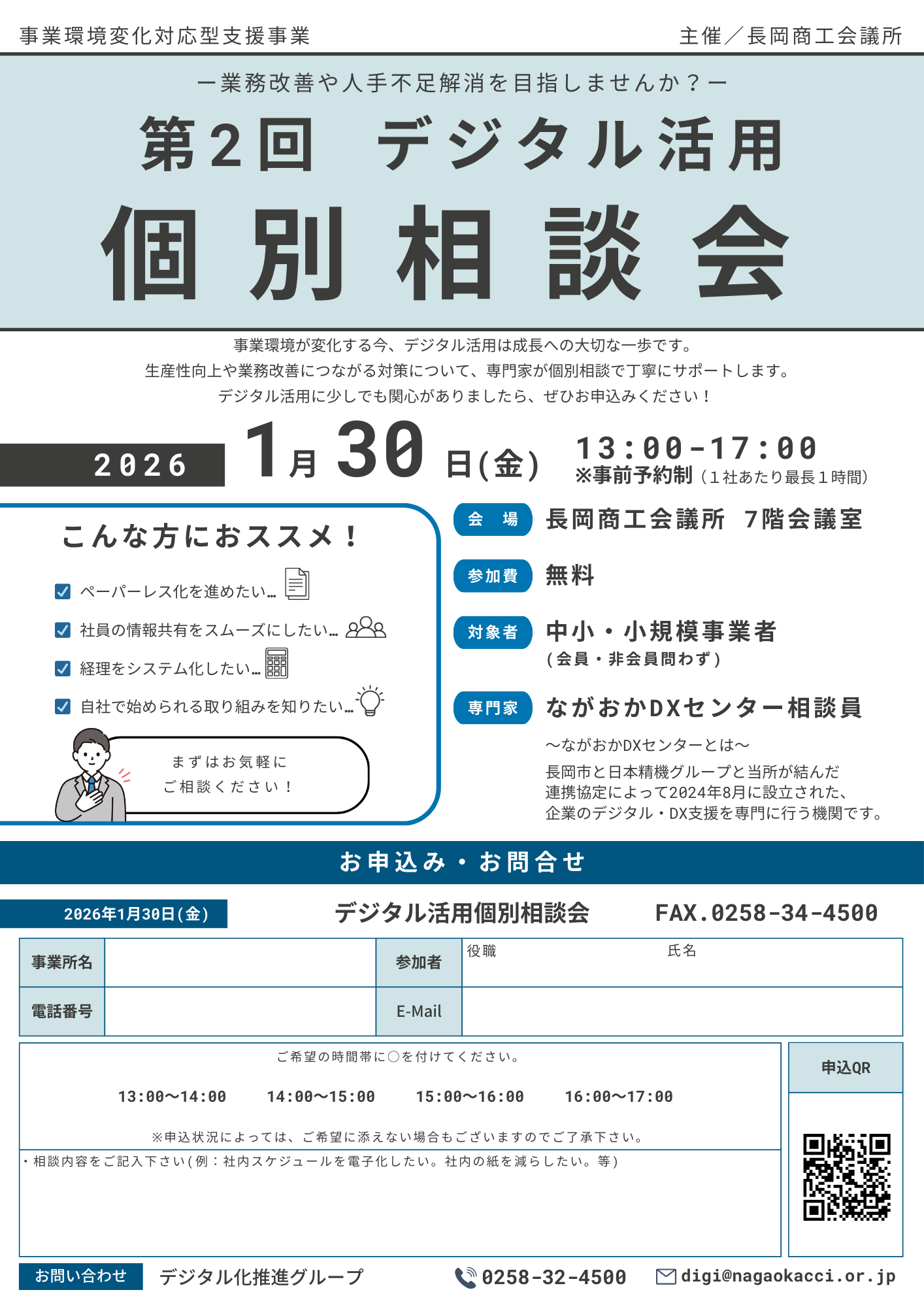 事業環境が変化する今、デジタル活用は成長への大切な一歩です。この度、当所では、「ながおかDXセンター」協力のもと、デジタル活用に関する個別相談会を開催します。