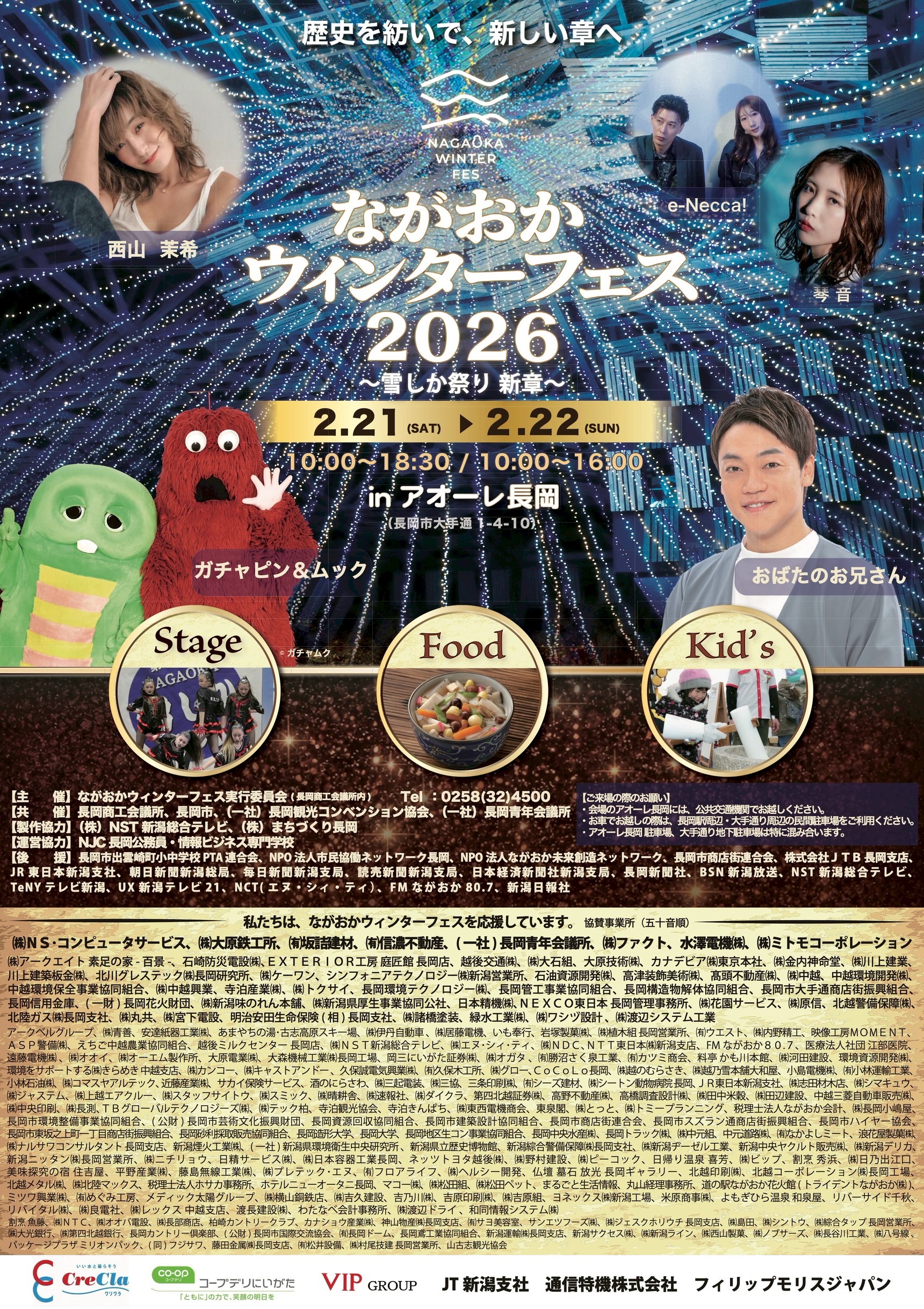 40年に渡り「雪を苦にせず、雪を活かす」、「長岡の冬を思いっきり楽しむ」ことを目的に長岡市民に長く愛されてきた「雪しか祭り」の後継イベントとして、本年度からは会場をアオーレ長岡に移して開催します。【日時】令和8年2月21日(土)10:00~18:30/22日(日)10:00~16:00