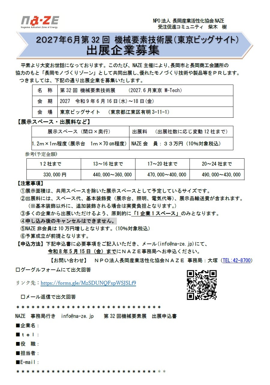 日本最大級の製造業の展示会に出展します。 技術・製品等の発信や新規受注獲得の場としてご活用ください。 ・会 期 令和9年6月16日(水)~18日(金) ・会 場 東京ビッグサイト(東京都江東区有明3-11-1) ・出展料 NAZE会員:330,000円(税込)~/NAZE非会員:430,000円(税込)~ ※出展社数に応じ変動(こちらの出展料(案)参照) ・出展品 IT、DX製品、部品、設備、装置、設計製品 など ・申込締切 令和8年5月15日(水) ・お申し込み先 https://forms.gle/MzSDUNQFxpWSJSLf9 ★詳細 ↓下記チラシをクリック![]()