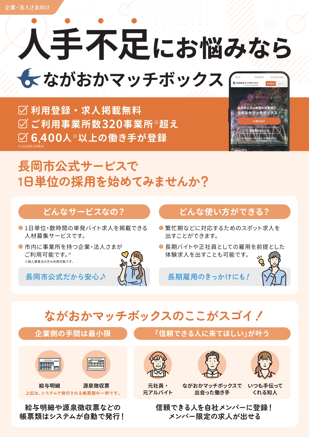 長岡市公式サービスで1日・数時間単位で人材募集ができる『ながおかマッチボックス』に新しい機能ができました。一度ながおかマッチボックスを通して働いてくれた方や、お知り合いの方、退職者の方などを