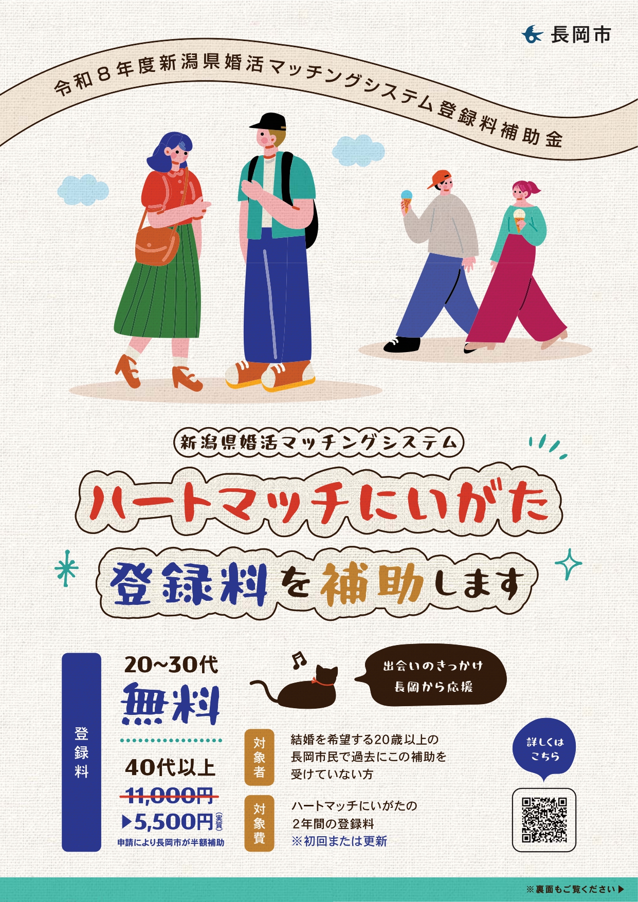 長岡市では、結婚を希望する方への婚活マッチングシステム(ハートマッチにいがた)の登録料補助や、若い世代の結婚に伴う新生活を支援するため、住居費や引越費用等を補助する「結婚新生活支援補助金」事業を実施しております。ぜひご利用ください。各制度の概要は以下のとおりです。