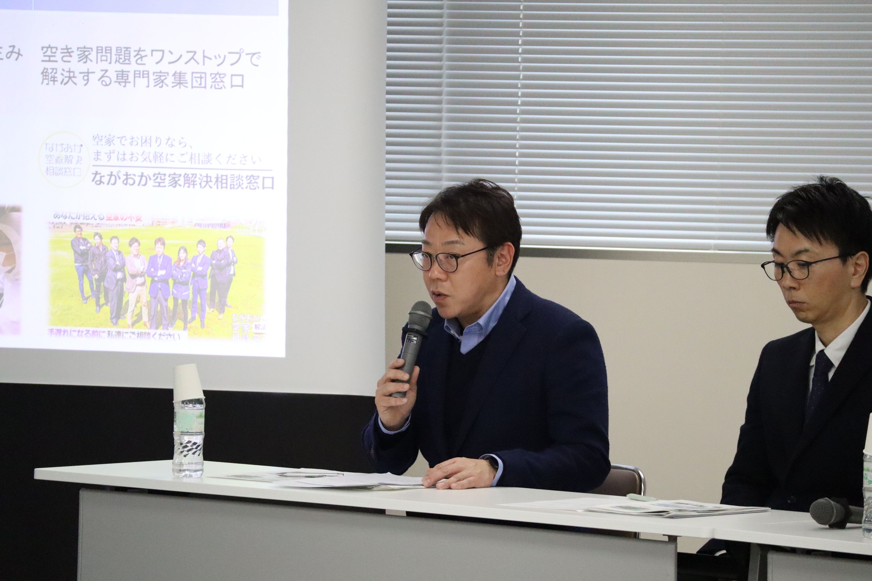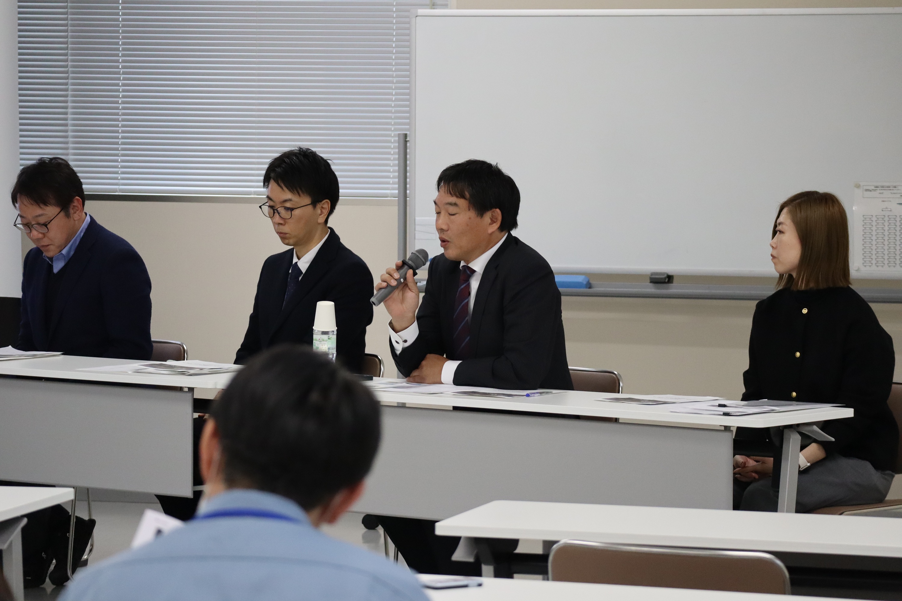 11月25日(火)当所6階会議室において、健康経営セミナーpart2「中小企業の健康経営を学ぶ」を開催しました。第1部は、まちの保健室K-create 代表 片野英明氏より「それならできそう!私の会社の健康経営」をテーマに講演いただき、第2部は「自社の健康経営の取組み」をテーマに片野氏をコーディネーターに長岡市内の企業から(株)丸共 代表取締役 金内宏彰氏、(株)プランビー 代表取締役 井利元聖史氏をパネラーとして自社の健康経営についてお話しいただきました。(出席者 21名)