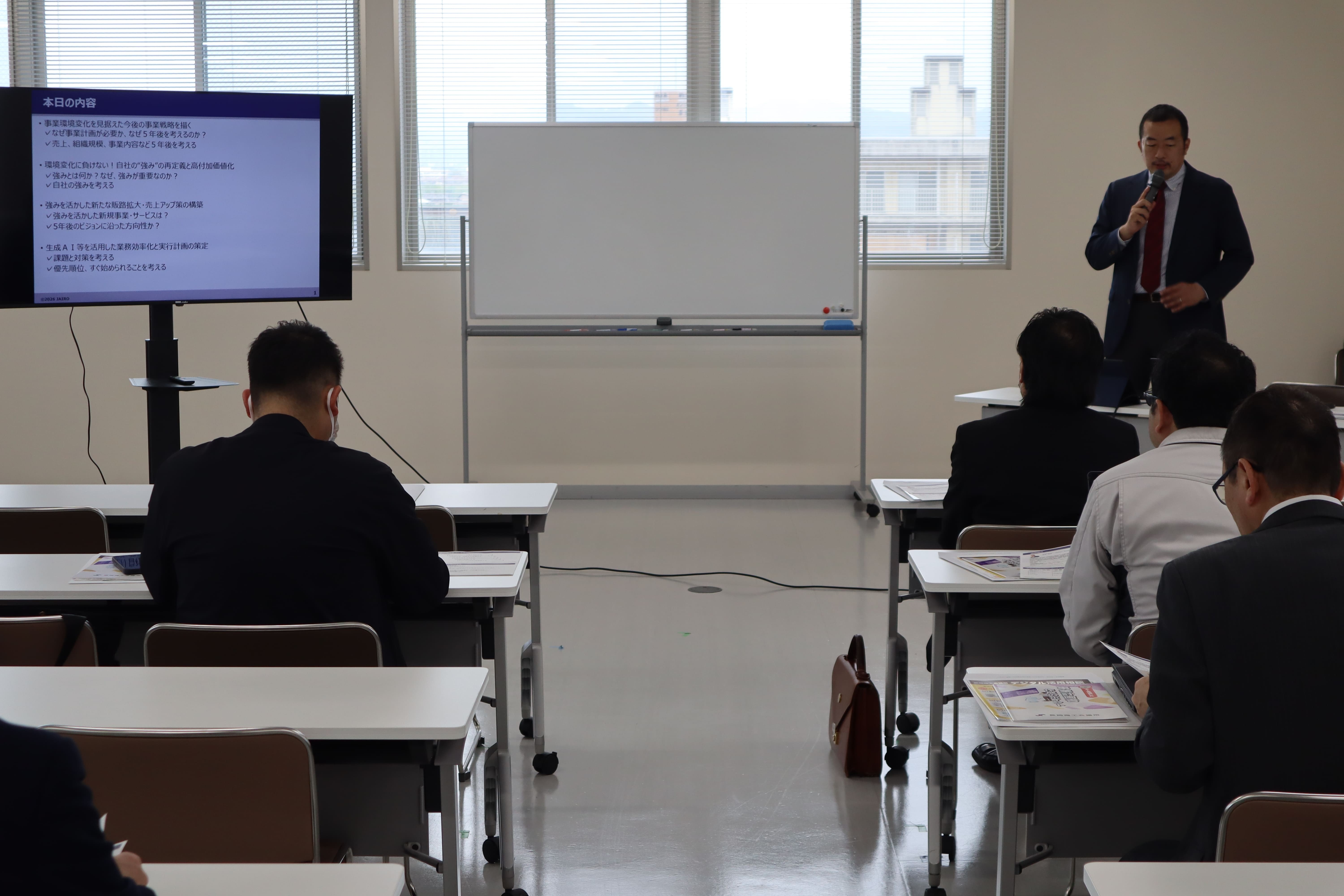ジャイロ総合コンサルティング株式会社 コンサルタントの若林和哉氏により、「事業環境変化を見据えた今後の事業戦略を描くには」、「自社の強みを活かした新たな販路拡大・売上アップ策の構築」などについて、ワークを交えてわかりやすく解説いただいた。